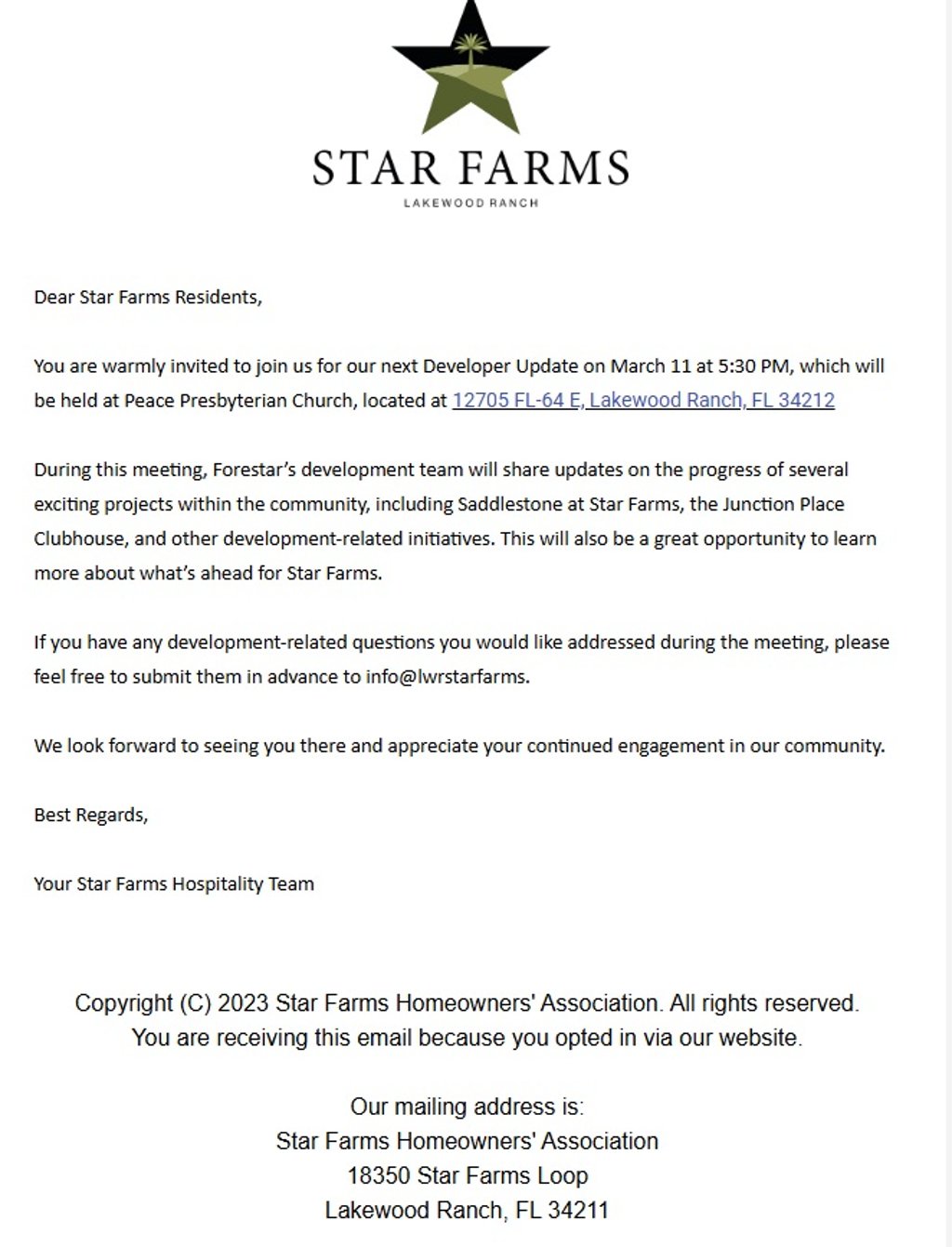 Should you have any questions or wish to share feedback, our HOA office is at your service—call us at (941) 259-4512 or email info@lwrstarfarms.com. Your thoughts help us make Star Farms even more extraordinary.